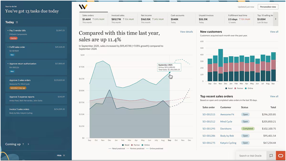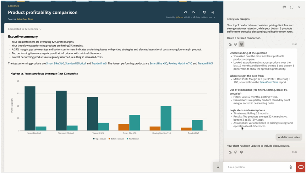 These visualizations, natural language reasoning, and agentic workflow suggestions remove the need to remember menus or navigate several complex reports.Ask Oracle cites its data sources, with which you can check its math, verify data, and even make corrections if needed, delivering full transparency and trust.